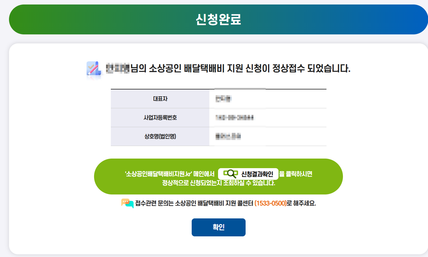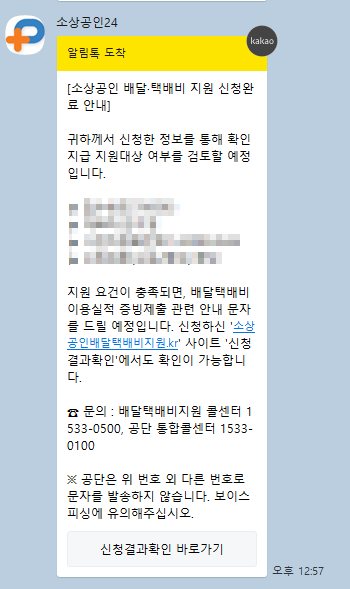 그러면 이렇게 신청 완료 화면이 뜨고 카톡으로 소상공인 배달 택배비 지원 신청완료 안내 메세지가 올거에요.