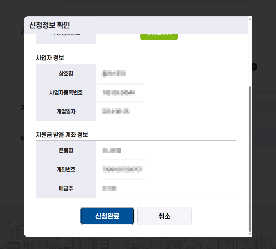 그 후 나오는 페이지에서 사업자등록 정보 입력후 확인하고, 입금받을 계좌번호와 예금주 확인후 신청완료하시면 됩니다.